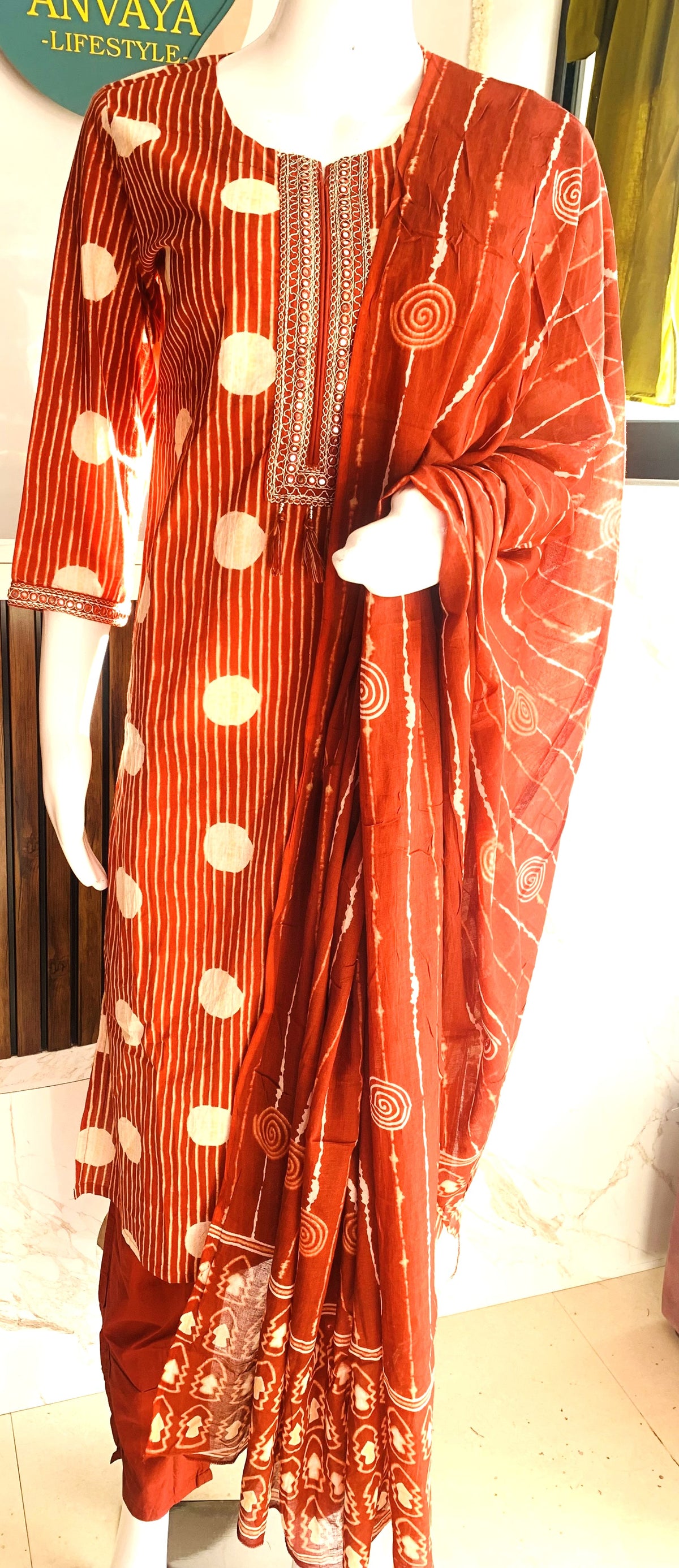 Crafted from breathable pure cotton, this elegant suit set features fine neck detailing that adds a refined touch. Paired with a comfortable cotton bottom and a soft mul cotton dupatta, it’s designed for all-day comfort while keeping the look graceful and polished. Ideal for daily wear, office, or casual gatherings.